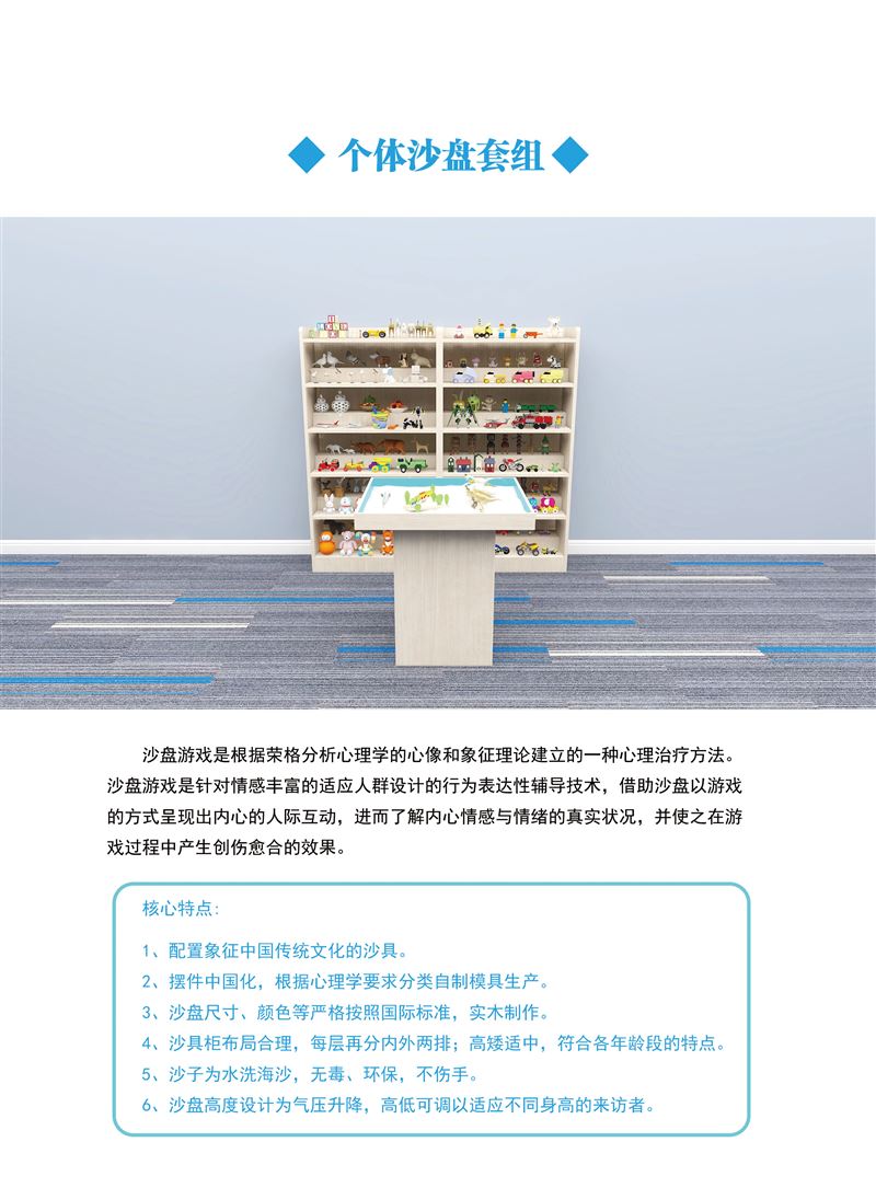 含個(gè)體沙盤1個(gè),沙具架2個(gè)、1200個(gè)沙具、精選天然消毒海沙、沙耙工具。
