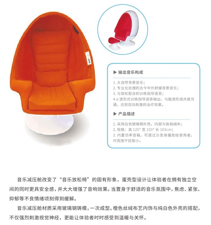 減壓太空艙改變“音樂放松椅”的固有形象,蛋殼型設(shè)計(jì)讓體驗(yàn)者在擁有獨(dú)立空間的同時(shí)更具安全感,并且也大大增強(qiáng)了音響效果。當(dāng)置身于舒適的音樂氛圍中,焦慮、緊張、抑郁等不良情緒頃刻得到緩解。材質(zhì)主要采用玻璃鋼鑄膜,一次成型,橙色絲絨布藝內(nèi)飾與純白色外殼的搭配,不僅強(qiáng)烈刺激視覺神經(jīng),更能讓體驗(yàn)者時(shí)時(shí)感到溫暖與關(guān)懷。